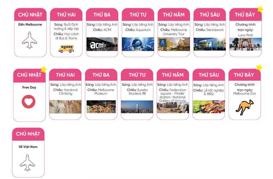 Không chỉ học trong lớp, học sinh sẽ có cơ hội thực hành tiếng Anh mỗi ngày trong môi trường sống thực tế tại Melbourne và Sydney - Wollongong - Canberra, từ đó nâng cao ngoại ngữ một cách tự nhiên, đồng thời phát triển sự tự tin, kỹ năng sống và tư duy độc lập trong môi trường quốc tế.