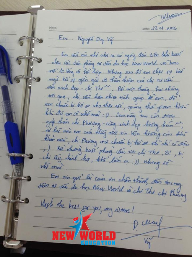 Em vẫn còn nhớ như in cái ngày đầu tiên khi bước chân vào văn phòng tư vấn du học New World với bao nỗi lo lắng và hồi hộp. Nhưng sau đó Em thật sự bất ngờ bởi sự gần gũi và thân thiện của Chị tư vấn viên xinh đẹp Chị Thơ. Rồi một tháng, hai tháng trôi qua Chị vẫn luôn nhiệt tình giúp đỡ Em để Em chuẩn bị hồ sơ cho thật tốt, quãng thời gian khốn khó đó EM sẽ nhớ mãi :) . Sau này Em còn được gặp thêm chị Phượng cũng xinh đẹp không kém :) , từ lúc nào Em cảm thấy việc xin Visa không còn khó khăn nữa....