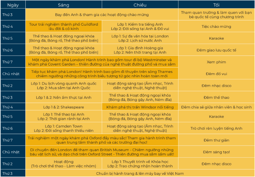 Xuyên suốt hành trình, học viên sẽ trực tiếp tham quan các địa danh biểu tượng của nước Anh, trải nghiệm văn hoá, lịch sử và đời sống hiện đại tại các thành phố lớn như London, Oxford, Cambridge và Windsor.