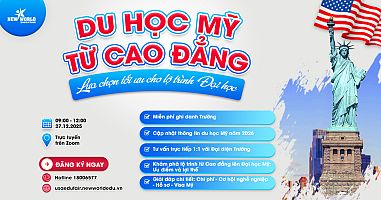 Vì thế, cơ hội được học tại nước Mỹ chính là niềm mơ ước và cơ hội của học sinh khắp nơi trên thế giới trong đó có Việt Nam. Nhằm giúp các em định hướng và xây dựng chiến lược du học Mỹ thành công, New World Education trân trọng tổ chức buổi hội thảo du học Mỹ với chủ đề “Định hướng ngành - Phỏng vấn học bổng Mỹ 2022”: - Thời gian: 9:00 ngày 27 tháng 11 năm 2021 - Trực tuyến trên ứng dụng Zoom Hội thảo xoay quanh những chủ đề mà học sinh và phụ huynh quan tâm nhất khi du học Mỹ và giải đáp những thắc mắc mà nhiều học sinh và phụ huynh gặp phải khi làm chuẩn bị kế hoạch du học như chọn trường, chọn ngành phù hợp, kế hoạch luyện thi đạt điểm cao, làm hồ sơ, viết luận, xin visa, phỏng vấn Mỹ, xin học bổng cùng nhiều ưu đãi hấp dân: Ưu đãi: + Miễn phí ghi danh vào trường Mỹ + Săn học bổng cao 50-100% + Ưu đãi 4,000,000 VND từ New World Education + Gift Voucher 5,000,000VND từ YES IELTS ĐĂNG KÝ TẠI ĐÂY |