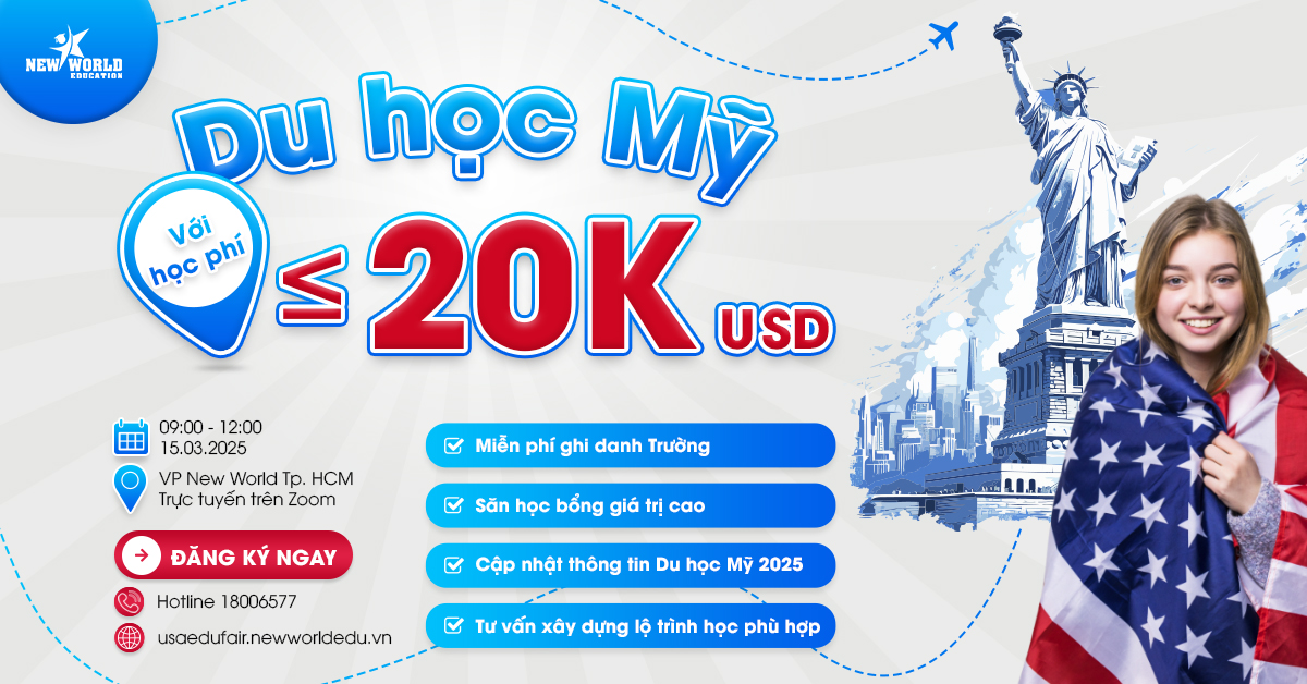 Bạn có biết, với ngân sách học phí chỉ ≤ 20K USD/năm, bạn đã có thể theo học tại một Trường Đại học chất lượng tại Mỹ? Cùng New World Education tham khảo ngay danh sách các Trường Đại học chất lượng với mức học phí hạt dẻ cùng nhiều chương trình học bổng cho sinh viên quốc tế tại sự kiện ngày 15/03/2025.