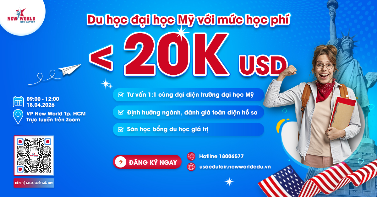 THÔNG TIN SỰ KIỆN . Thời gian: 9h00, thứ bảy ngày 18/04/2026 · Hình thức: Văn phòng New World Hồ Chí Minh + kết hợp trực tuyến trên Zoom · Khách mời: Đại diện các Trường Đại học tại Mỹ Các bạn đăng ký dự chương trình, vui lòng đăng ký “ TẠI ĐÂY ” |