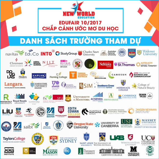 EDUFAIR – CHẮP CÁNH ƯỚC MƠ DU HỌC Tại: Văn phòng New World Education - Địa chỉ: Lầu 7, 242 Cống Quỳnh, phường Phạm Ngũ Lão, Quận 1, TPHCM ( Tòa nhà Ngân hàng Sài Gòn - SCB Bank ) - Đăng ký tham dự Miễn Phí: https://goo.gl/1bvDRa |