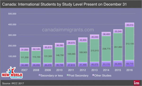 Tính đến ngày 31/12/2016, tại Canada có 414,285 sinh viên quốc tế (có giấy phép học tập) – tăng 18% so với năm trước.